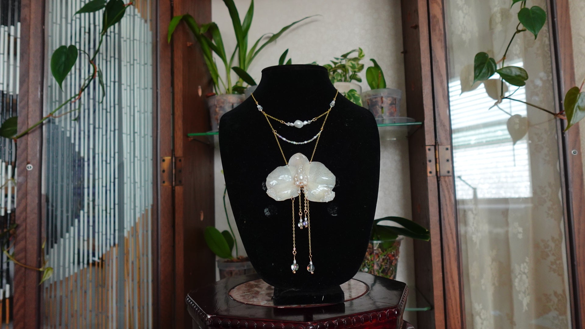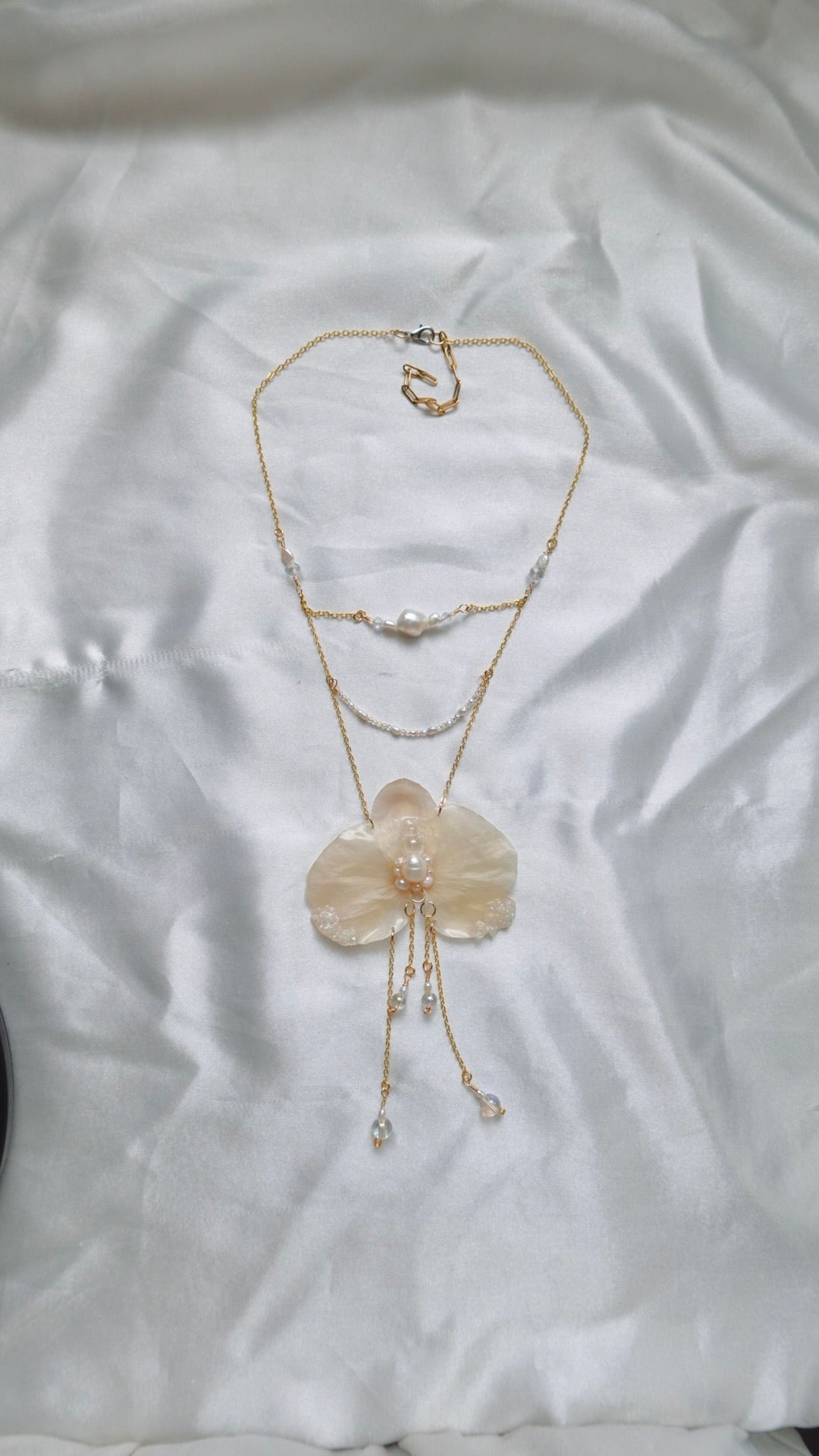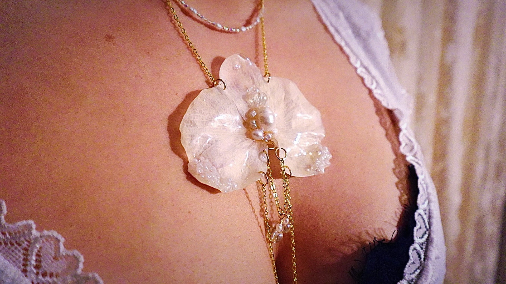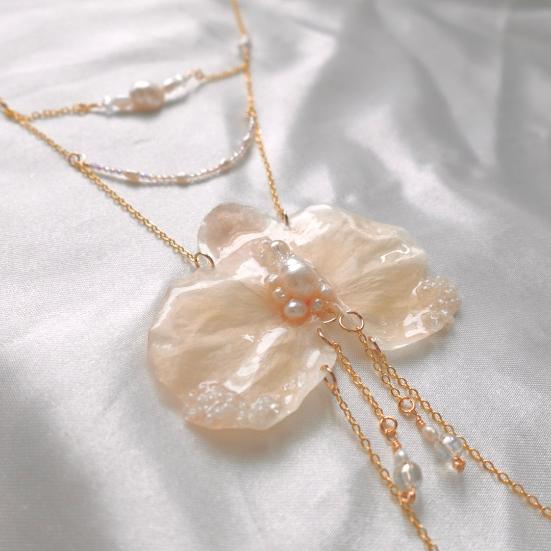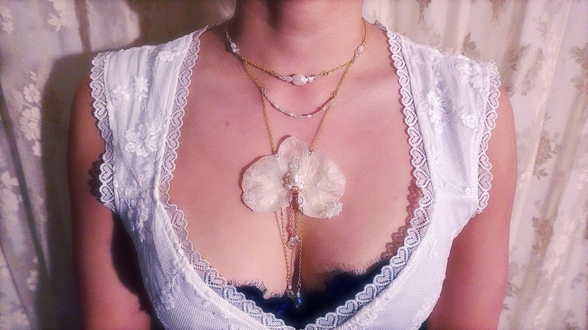 Truly an enchanting and ethereal piece. Perfect for music festivals, art shows, or just to make a fashion statement. This piece is created out of an 18k gold filled chain, freshwater pearls, glass beads, crystal beads, and a preserved white orchid.